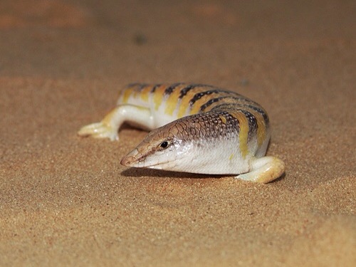 This little golden lizard has a long, wedge-shaped snout it uses to quickly burrow into the sand to escape from predators. Its body has flattened sides and is covered with smooth, shiny scales. Its legs are short and sturdy, with long, flattened toes and a tail that tapers to a point.
